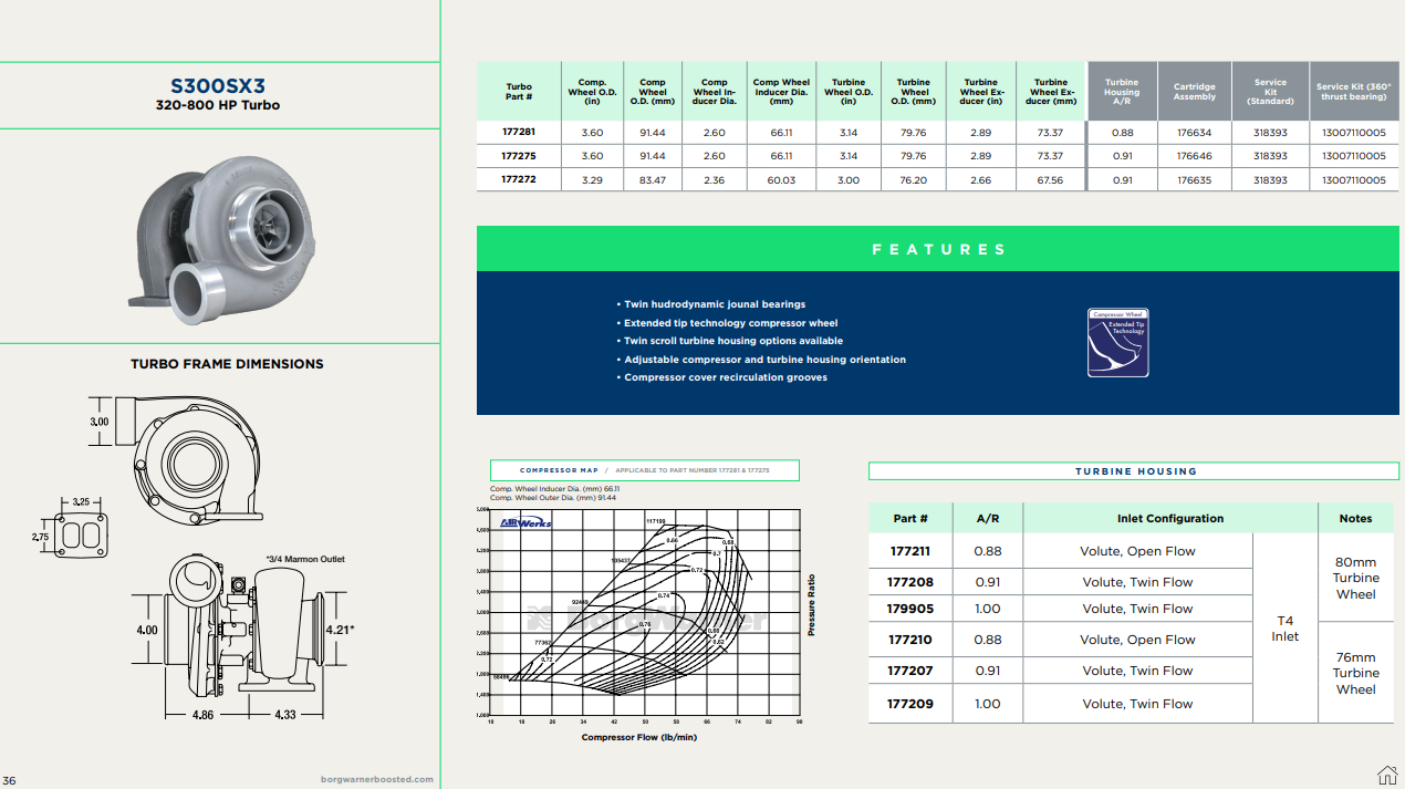 - BORGWARNER 177281 – S300SX3 Turbocharger (S366/74, .88 A/R, T4)